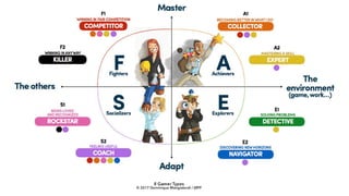 3) Effective gamification involves understanding player types and using techniques that align with core human drives like achievement, creativity, social influence, scarcity, and unpredictability.