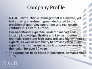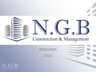 N.G.B. Construction & Management is a Romanian investment group with over 30 years of experience in quarrying and real estate. The group owns and manages over 1 million square meters of land in Romania. In 2010, the group expanded its services to include project management, investment management, architecture and engineering, and marketing. The goal is to lead the development of next generation buildings in the region with integrity, perseverance, and loyalty.