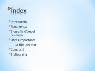 ·Àngel Guimerà vaser dramaturg i poeta. ·Escrivia les seves obres en català. ·Va fer un dels màxims exponents de la Renaixença a finals del s.XIX.