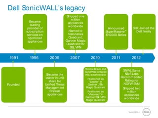 This document provides an overview of Dell SonicWALL's next generation firewall solutions. It summarizes the company's history and leadership position in unified threat management firewall appliances. Key capabilities of SonicWALL's next generation firewall architecture are described at a high level, including deep packet inspection, application identification and control, single sign-on, and security services like intrusion prevention and SSL decryption. Common deployment scenarios are also outlined, such as traditional NAT gateway deployments, high availability configurations, and inline or wireless access point modes.
