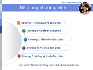 Tài liệu trình bày về nghệ thuật đàm phán, bao gồm các khái niệm, đặc điểm, phương thức và phong cách đàm phán. Nó nhấn mạnh tầm quan trọng của đàm phán trong kinh doanh và cuộc sống hàng ngày, cũng như các giai đoạn và kỹ thuật cần thiết để đạt được kết quả tốt nhất. Cuối cùng, tài liệu khuyến khích việc luyện tập kỹ năng đàm phán để trở thành bậc thầy trong lĩnh vực này.