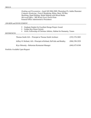 The document is a resume for Nghi Vollmer seeking an entry-level position in interior design. It outlines her education including a Bachelor's in Architecture from the University of Florida in 2009. Her experiences include administrative and design work at several architecture firms from 2007 to present. She has skills in AutoCAD, rendering software, modeling, drafting and Microsoft Office.