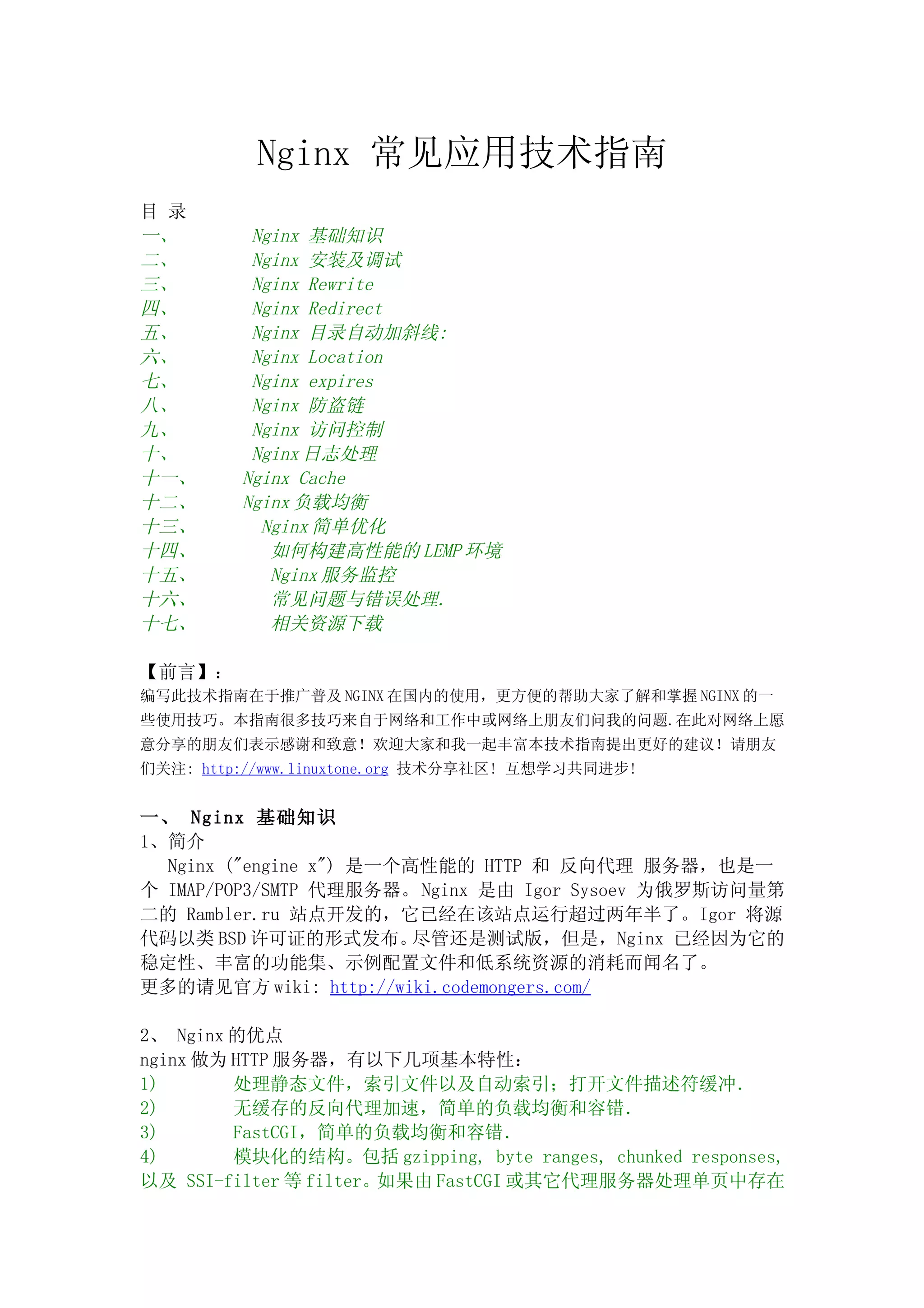 本文档是关于 nginx 的技术指南,涵盖了 nginx 的基础知识、安装调试、重写规则、重定向、访问控制、日志处理等主题。文档的目的是普及 nginx 的使用技巧,并提供各种实用配置示例,以帮助用户掌握其性能优化和安全设置。通过分享来自网络和工作中的经验,鼓励社区用户共同进步。