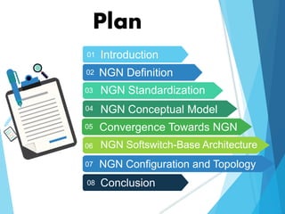 This document provides an overview of Next Generation Networks (NGN). It defines NGN as a packet-based network that provides telecommunication services and allows for multiple broadband transport technologies. The document discusses NGN standardization by organizations like ITU-T, convergence towards NGN through the integration of networks like PSTN and mobile, and the softswitch-based NGN architecture featuring components like media gateways, application servers, and media servers.