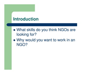 NGOs seek candidates with strong interpersonal, research, writing, communication, and project management skills. They offer opportunities for intellectual growth and experience in diverse environments, though salaries may not be high. Khanya-aicdd is a local African NGO that promotes sustainable development in Africa through facilitating learning exchanges. Humanities backgrounds provide a strong foundation in social issues and liberal thinking skills useful for NGO work. Thorough self-reflection and research into skills and opportunities is important when packaging oneself for the NGO job search.
