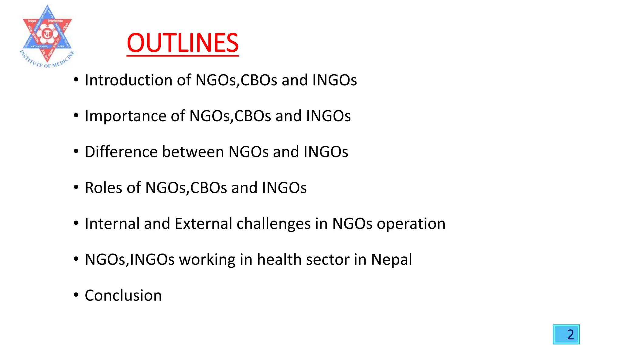 This document discusses the roles of NGOs, CBOs, and INGOs in community health development in Nepal. It defines NGOs as non-profit organizations that operate independently of governments, CBOs as grassroots organizations formed and run by community members, and INGOs as international NGOs overseen by Nepal's Social Welfare Council. There are around 54035 NGOs and 207 actively working INGOs in Nepal. These organizations work to improve access to healthcare, provide health education, and promote healthy behaviors, contributing up to 50% of healthcare services in some countries. They are vital to community health development by filling gaps in services, building local capacity, and addressing underserved areas.