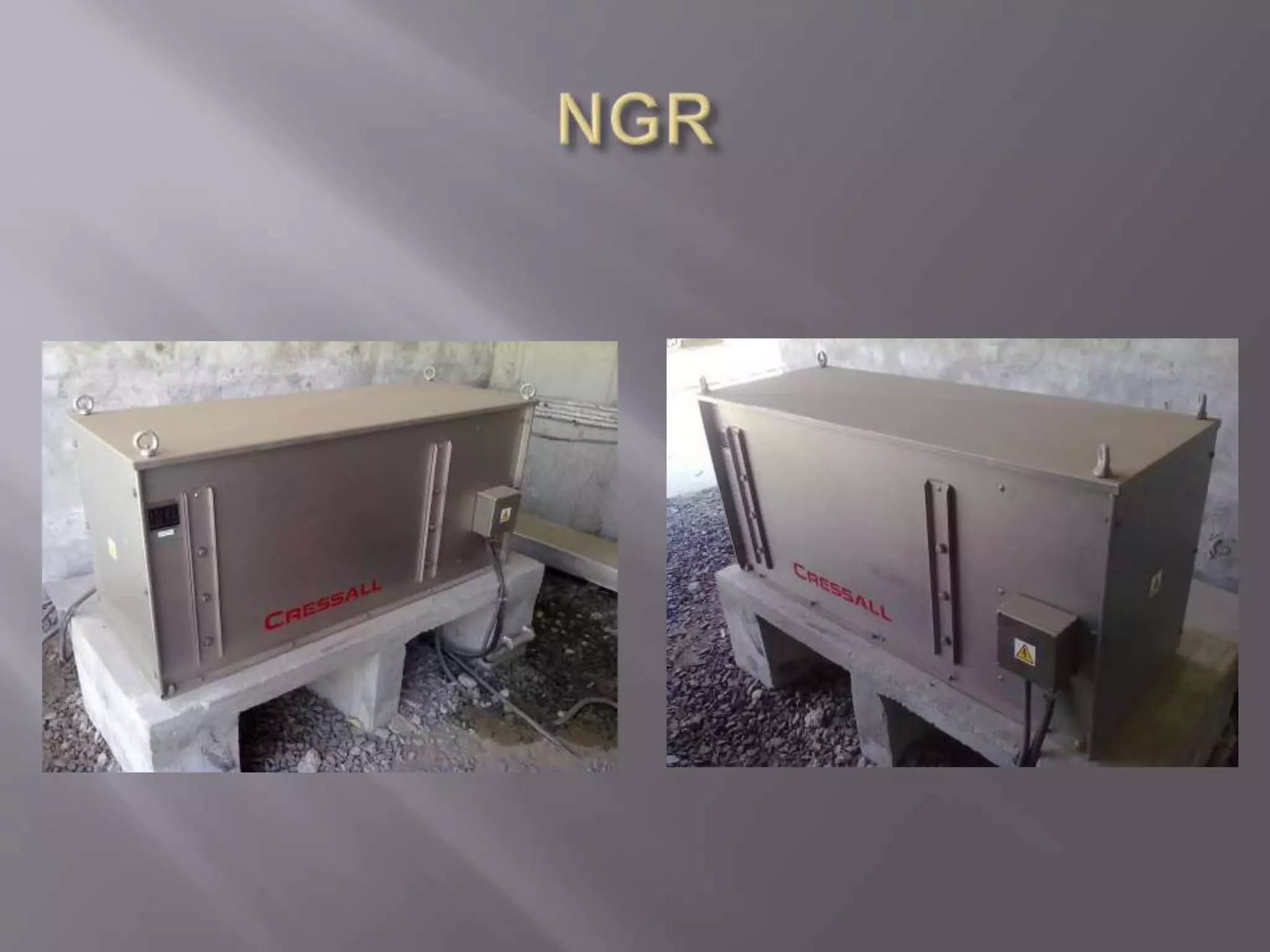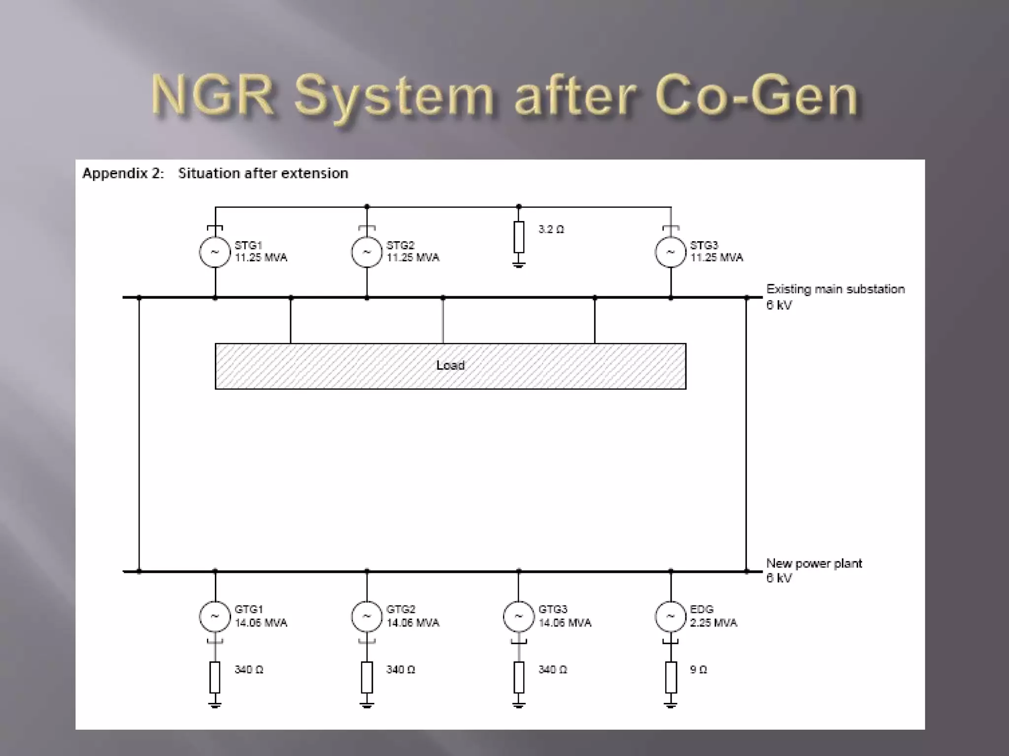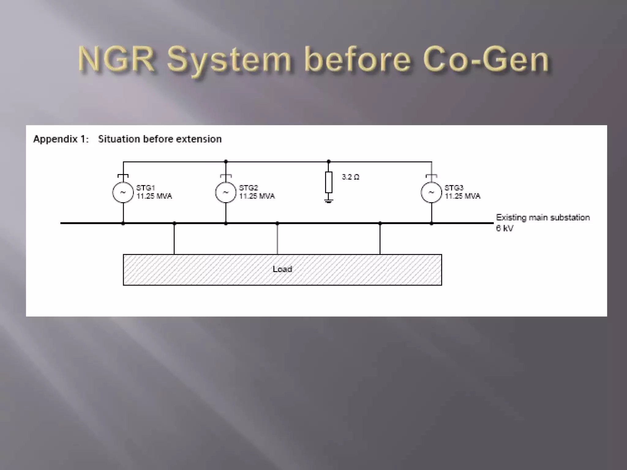 The document discusses neutral grounding resistors (NGRs) and zig-zag transformers. It explains that NGRs limit fault currents to prevent damage, and zig-zag transformers provide a return path for earth faults on delta systems. The document also provides details on the NGR and zig-zag transformer specifications and settings for a co-generation power system before and after installation of new generators.