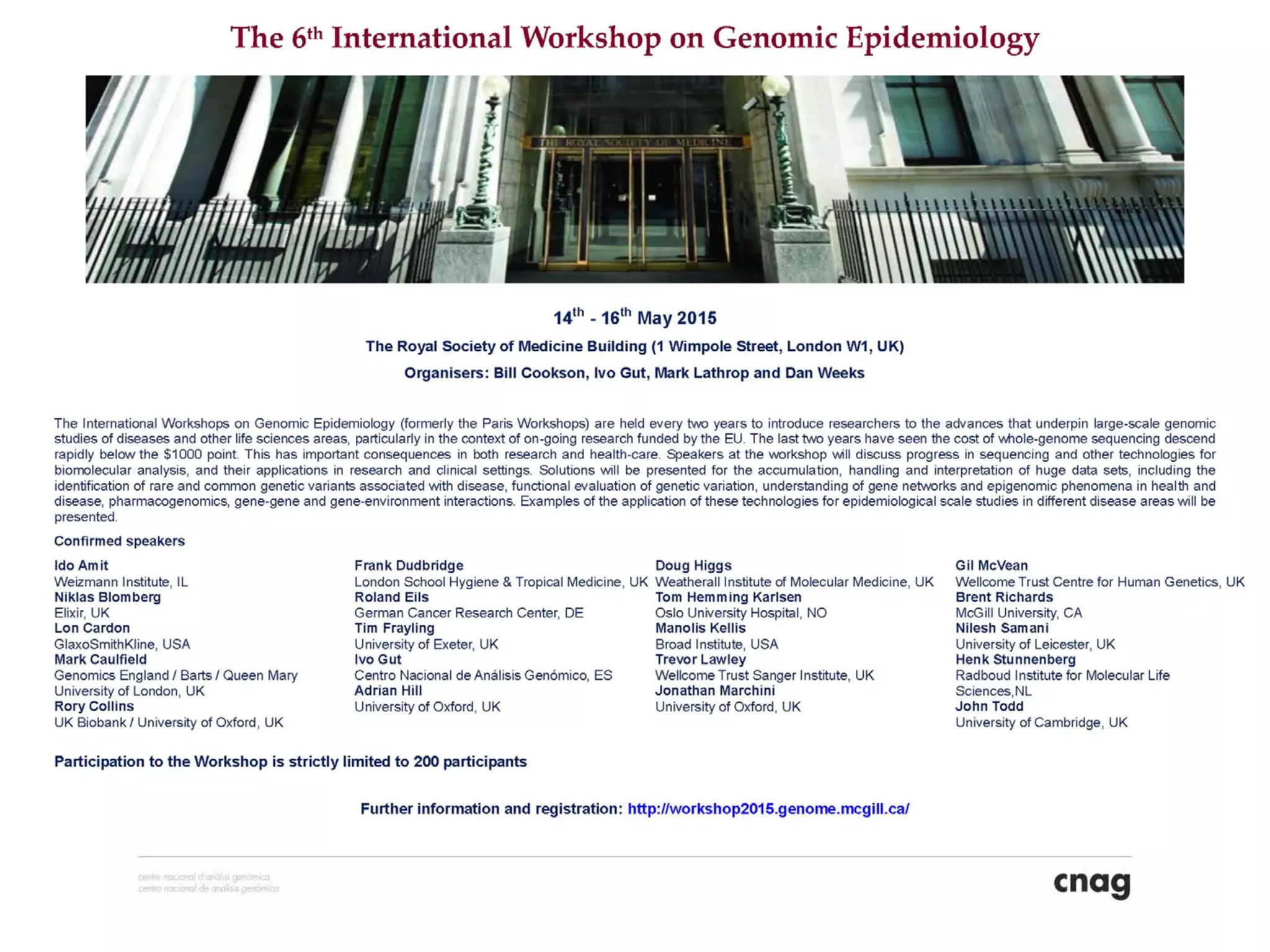 The document provides information about a short course on next generation sequencing and analysis of sequence variants. It includes an agenda with sessions on introduction to NGS applications in medical research, data analysis pipelines, interpretation of variants, and tools for predicting pathogenicity. It also provides background on the organizing institutions, the CNAG sequencing center and its projects, and an overview of bioinformatics analysis pipelines and resources.