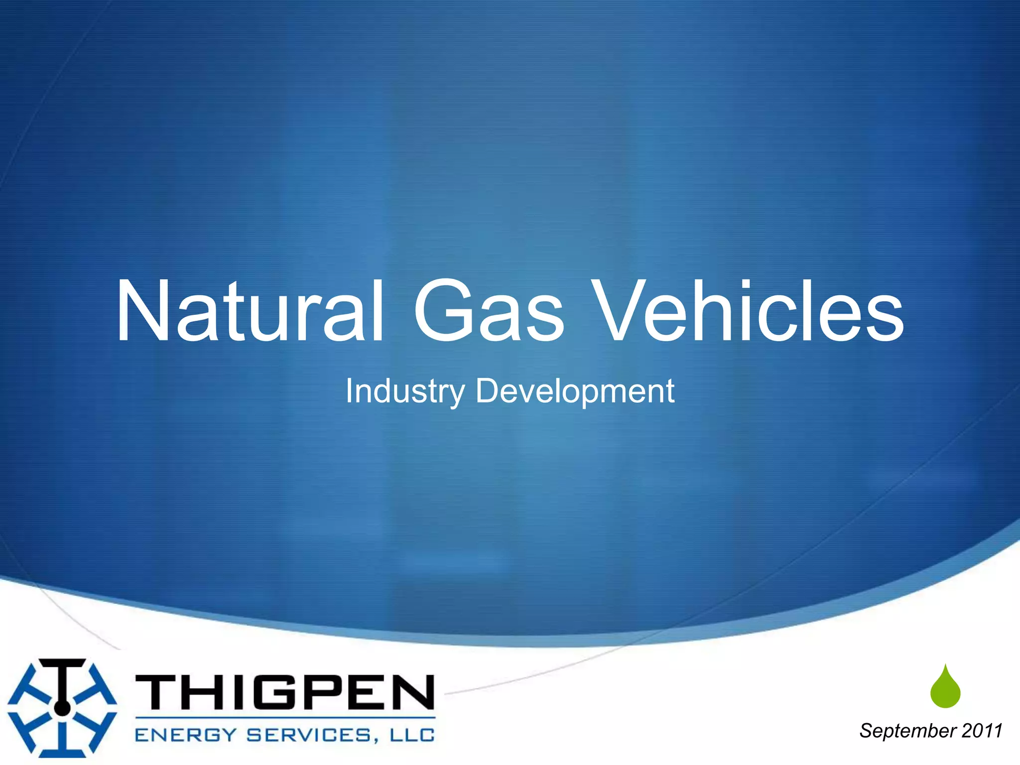 The document discusses the rise of the natural gas vehicle (NGV) industry, highlighting the economic advantages of utilizing natural gas over petroleum, including significant cost reductions and lower emissions. It details the infrastructure for compressed and liquefied natural gas, emphasizing efficient fueling systems and the reliability of natural gas supplies. Furthermore, it promotes the role of companies like Thigpen Energy Services in expanding NGV infrastructure to support this growing market in the United States.