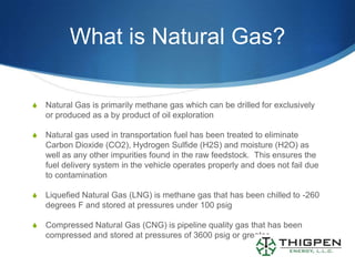 This document provides an overview of natural gas as a transportation fuel, detailing its types (CNG and LNG), benefits, and applications. It discusses the economic advantages of converting diesel vehicles to natural gas, including cost savings and reduced maintenance, along with infrastructure designs for fueling systems. The document also highlights safety regulations and the role of Thigpen Energy, LLC in facilitating the transition to natural gas vehicles.