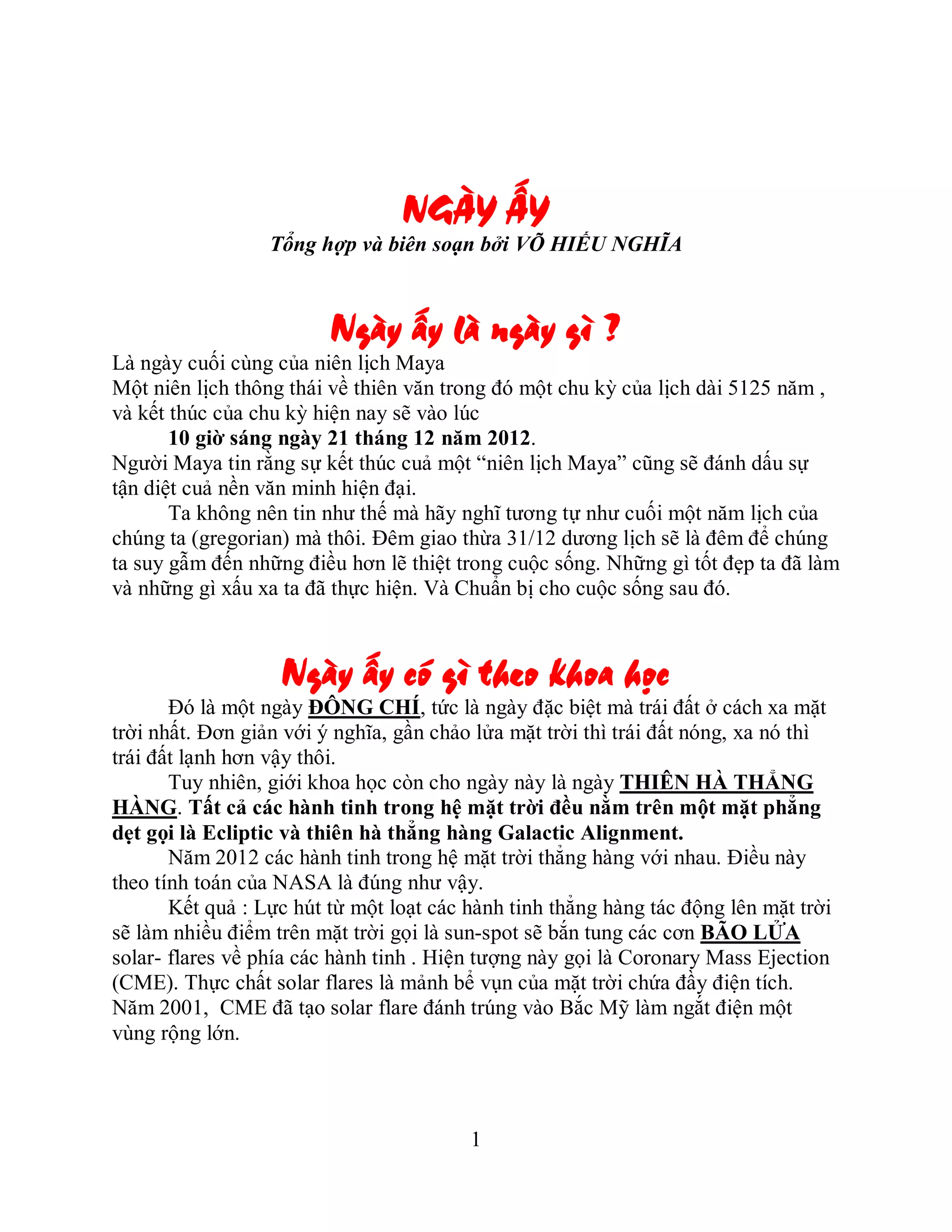 Tài liệu đề cập đến ngày 21 tháng 12 năm 2012, được coi là ngày kết thúc của niên lịch Maya và gắn liền với nhiều hiện tượng thiên nhiên, như đông chí và sự thẳng hàng của các hành tinh trong hệ mặt trời. Nó cũng nhấn mạnh những tác động của hoạt động con người đến trái đất, như sự nóng lên và biến đổi khí hậu, cùng với những tiên tri về sự tận diệt. Cuối cùng, tài liệu kêu gọi con người suy ngẫm về trật tự xã hội và vũ trụ, phản ánh sự cần thiết phải tự mài giũa đạo đức để đối phó với tương lai.