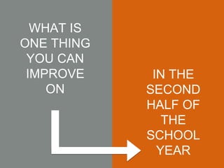 The document discusses improving classroom management and relationships in the second half of the school year. It provides tips and strategies for building positive relationships with students through movement, games, varied music, intentional mistakes, social media, one-on-one time, clear expectations, and positive greetings at dismissal. The document also includes a self-assessment to determine a teacher's cognitive style as either organizational or creative thinking.