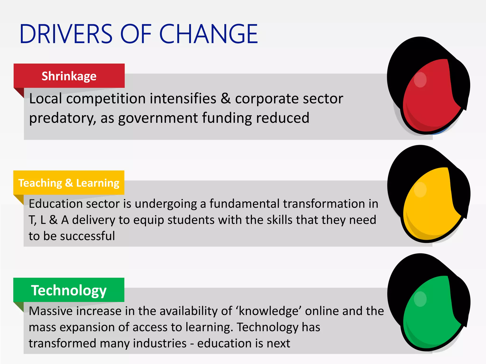 The document discusses the transformation of education to equip students with 21st century skills. It notes a massive increase in online knowledge and expanded access to learning through technology. Local competition is intensifying as government funding decreases. Employers seek "T-shaped" students and staff with both in-depth skills and broad social, entrepreneurial, and critical thinking abilities. The document outlines reforms to focus on student-centered, project-based learning with employer links and opportunities to earn while learning. Staff development emphasizes collaboration and moving away from external consultants to develop expert teachers and students.