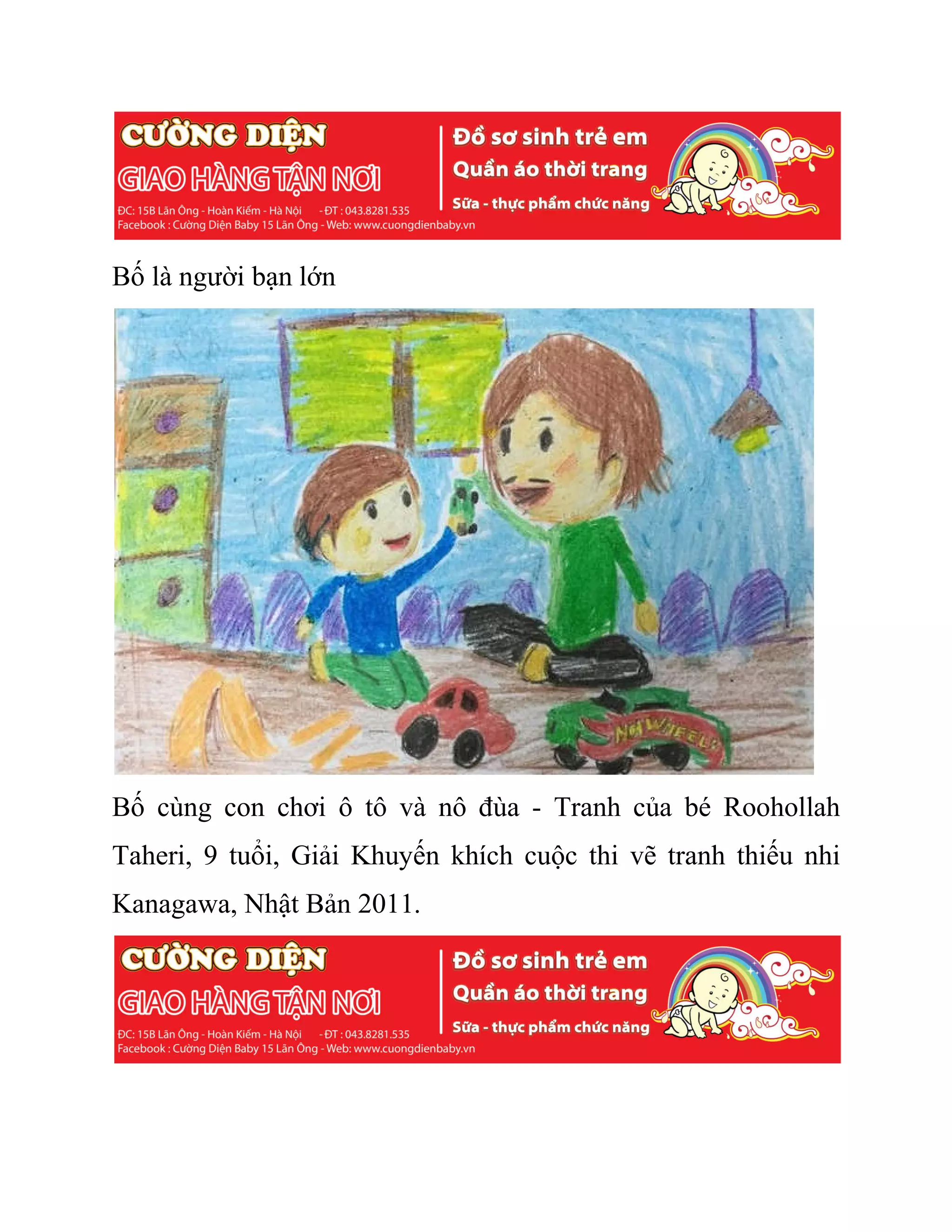 Tài liệu mô tả cách mà trẻ thơ nhìn nhận và cảm nhận về bố qua các bức tranh ngộ nghĩnh. Bố không chỉ là người nghiêm khắc mà còn là người bạn lớn, huấn luyện viên và siêu anh hùng trong mắt trẻ. Bằng việc dành thời gian cho con và cùng con khám phá cuộc sống, bố trở thành 'bố tuyệt vời'.