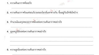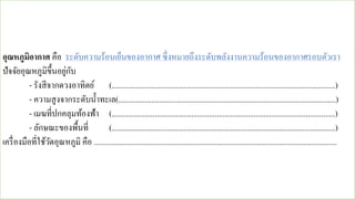ซึ่งหมายถึงระดับพลังงานความร้อนของอากาศรอบตัวเรา ปัจจัยอุณหภูมิขึ้นอยู่กับ - รังสีจากดวงอาทิตย์ (...................................................................................................................) - ความสูงจากระดับน้าทะเล(................................................................................................................) - เมฆที่ปกคลุมท้องฟ้า (...................................................................................................................) - ลักษณะของพื้นที่ (...................................................................................................................) เครื่องมือที่ใช้วัดอุณหภูมิ คือ .............................................................................................................................