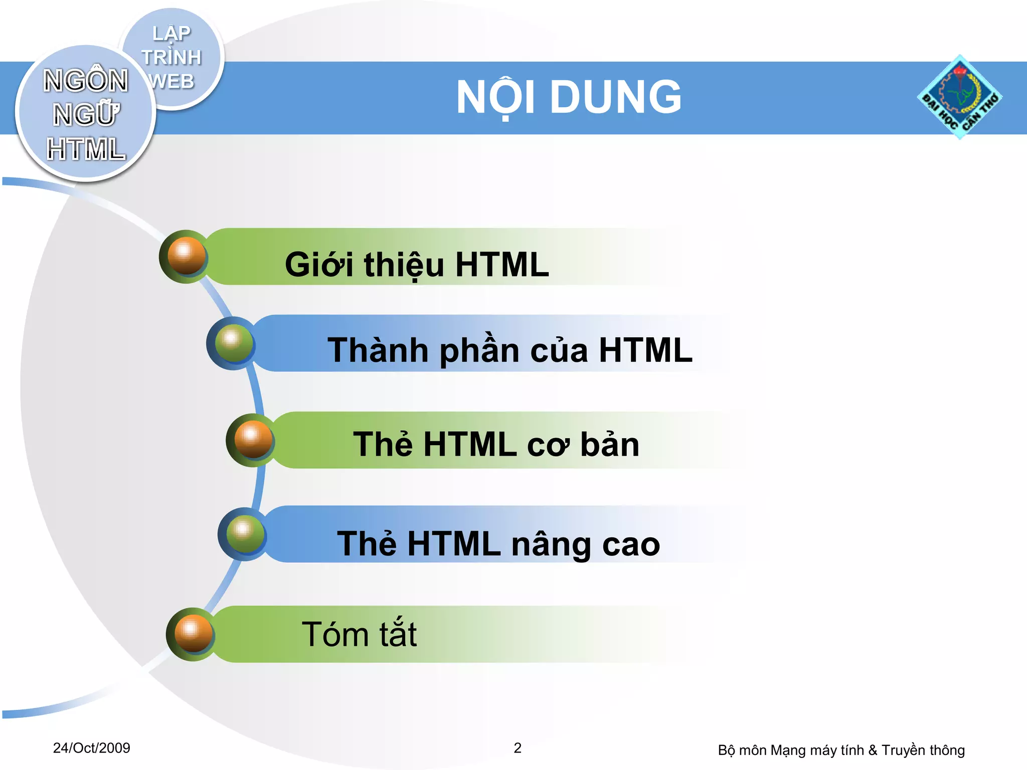Tài liệu trình bày về HTML, một ngôn ngữ đánh dấu siêu văn bản được phát minh bởi Tim Berners-Lee và khái niệm cơ bản về cấu trúc của trang web. Nó giới thiệu các thành phần chính như thẻ HTML, cách soạn thảo trang HTML và các thẻ định dạng, liên kết, frame và bảng. Ngoài ra, tài liệu cũng đề cập đến cách sử dụng địa chỉ tuyệt đối và tương đối trong HTML.
