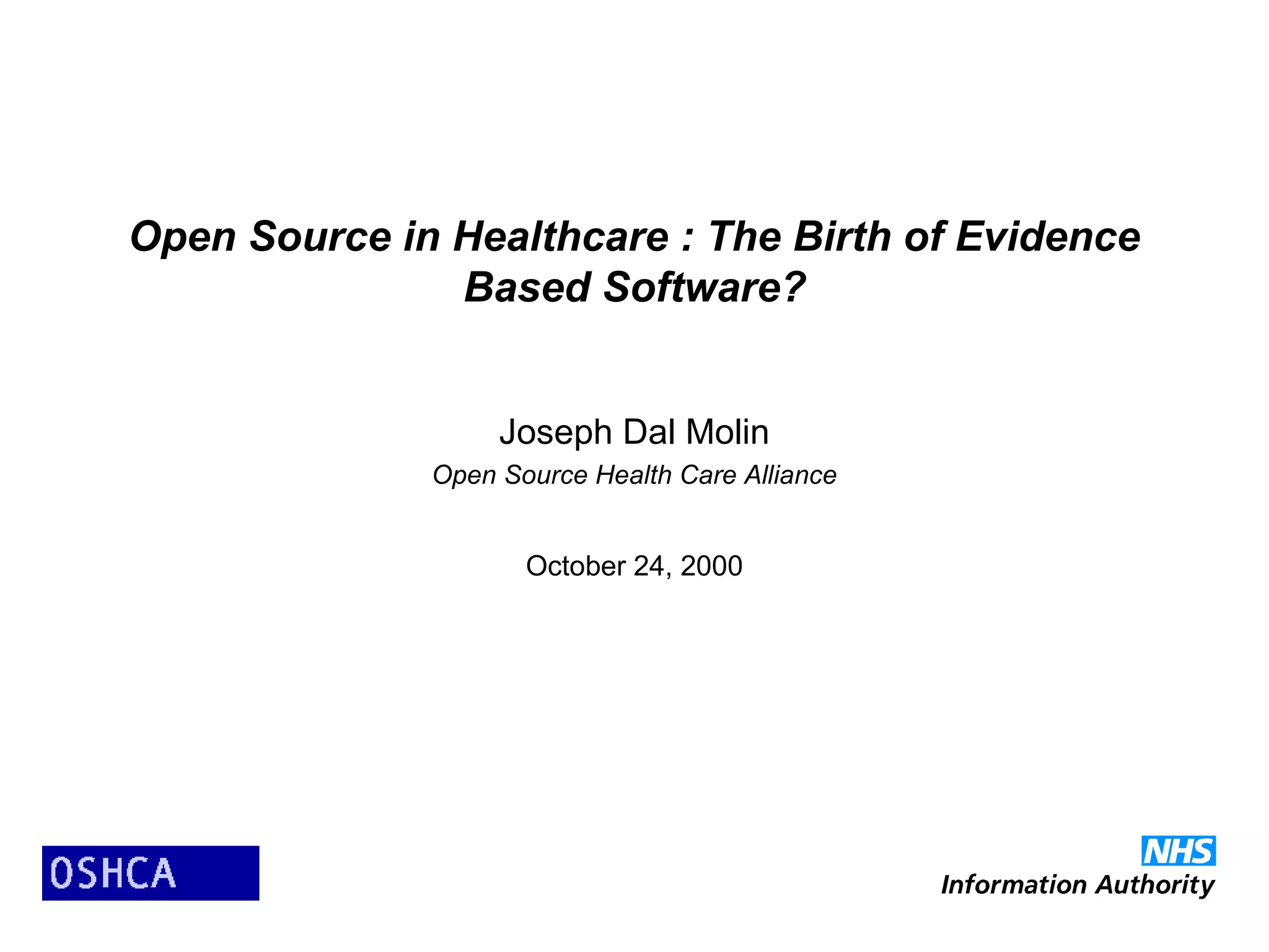 1) The document discusses the propagation of open source software in healthcare and argues that it is inevitable. It provides an overview of open source, how and why it works, examples of open source healthcare projects, and where open source in healthcare is heading.