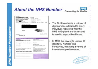 The NHS Number Programme aims to improve patient safety by minimizing clinical risks caused by misallocation of patient information and resolving barriers to safely sharing information across healthcare settings. Incidents of patient confusion and errors due to reliance on local hospital number systems have endangered patient safety. Priority settings for implementing the NHS Number include general practice, secondary care, ambulance services, and social care. Current projects include developing published standards for general practice and secondary care, as well as social care standard development and a public awareness campaign.