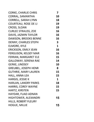 This document contains a list of names and their total NHS (National Honor Society) points. The names are listed alphabetically along with their respective point totals which range from 1 to 23 points.