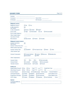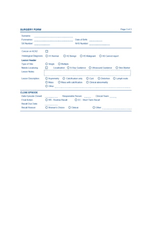 The document outlines quality assurance guidelines for surgeons involved in breast cancer screening within the NHS, aimed at ensuring high standards of care and diagnosis. It emphasizes the importance of assessment, diagnosis, and treatment processes, as well as adherence to waiting time targets to minimize patient anxiety. Additionally, the guidelines support collaboration within multidisciplinary teams to enhance the management of screen-detected breast cancer cases.