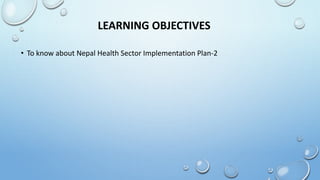1. The document summarizes Nepal's Health Sector Implementation Plan 2 (NHSP-IP 2), which aimed to strengthen Nepal's health system from 2010-2015 by improving access, equity, and quality of essential health services.
