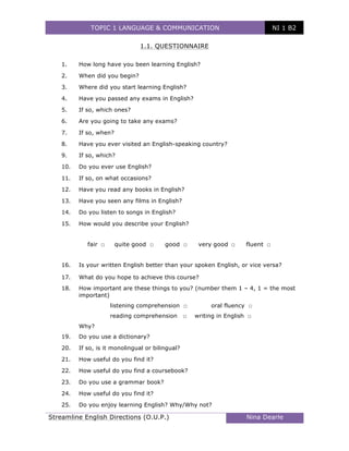 The document contains a questionnaire about an English language learning course. It includes questions about the student's experience learning English such as how long they have studied, what exams they have taken, if they have visited English-speaking countries, and how they practice English. It also asks about their goals for the course and preferences for focusing on skills like listening, speaking, reading or writing. Additional sections provide a reading passage about challenges children faced learning English in their classroom and discuss theories about acquiring versus learning a new language.