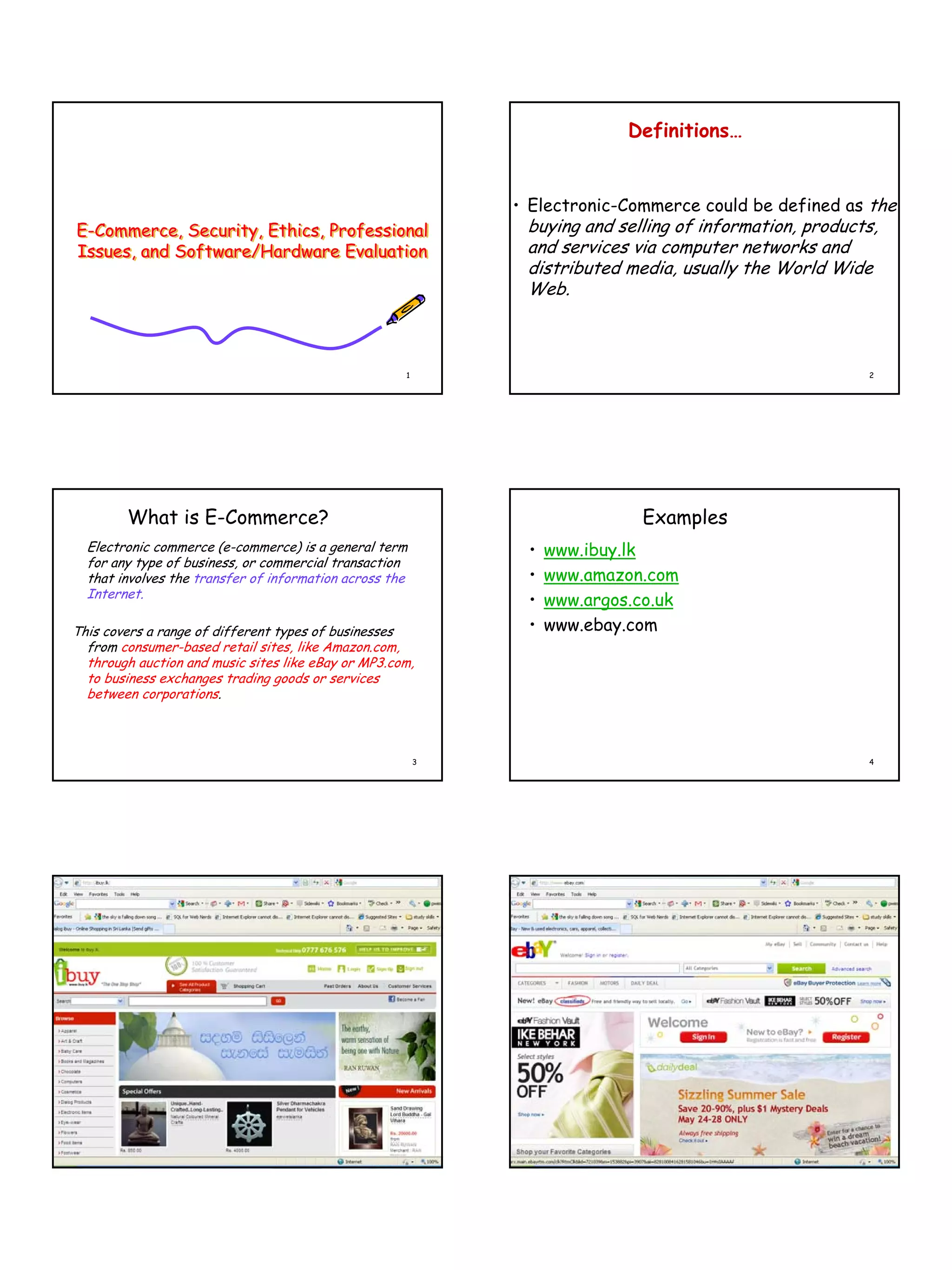 E-commerce involves the buying and selling of products and services over the Internet. It provides several advantages such as cost savings, increased efficiency, and access to a global market. However, it also poses challenges such as lack of trust, lack of understanding between departments, and resistance to change. When evaluating hardware, software and services for e-commerce, factors like quality, cost, flexibility, security and documentation should be considered. Standards like ISO/IEC 9126 define key quality characteristics for software.