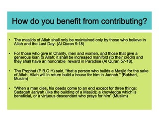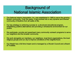 The document provides details about the new NIA Masjid and Islamic Center being constructed in Newark, New Jersey. It includes an overview of the current facilities and educational programs, as well as details about the new building such as its larger size, additional classrooms and meeting spaces, and more environmentally friendly design. A payment plan is outlined showing the projected costs of construction.