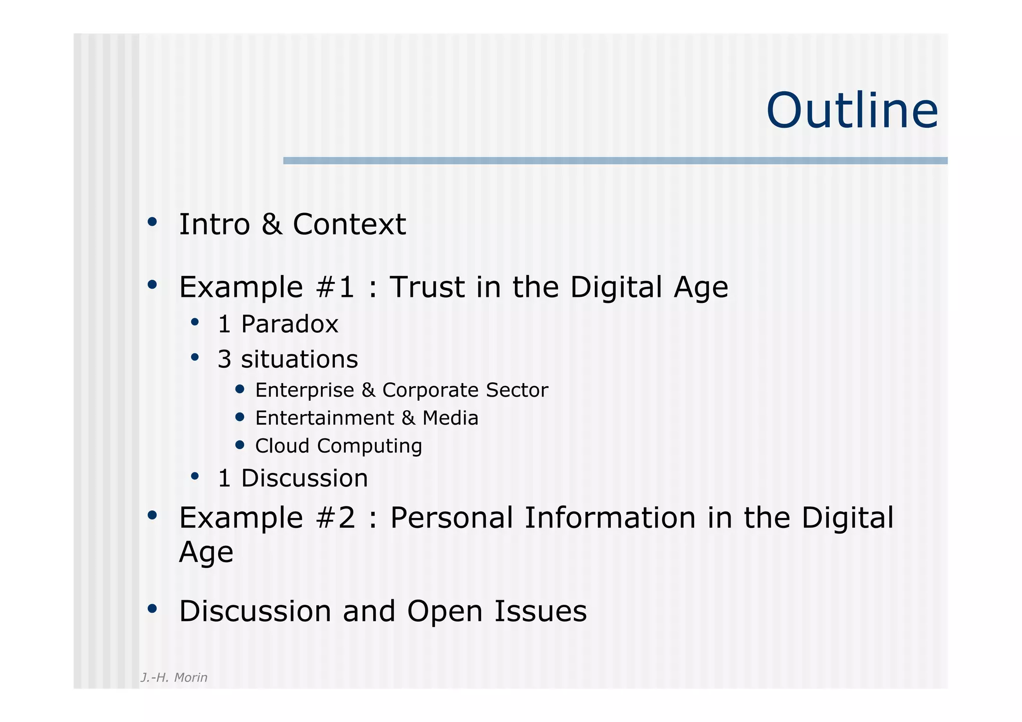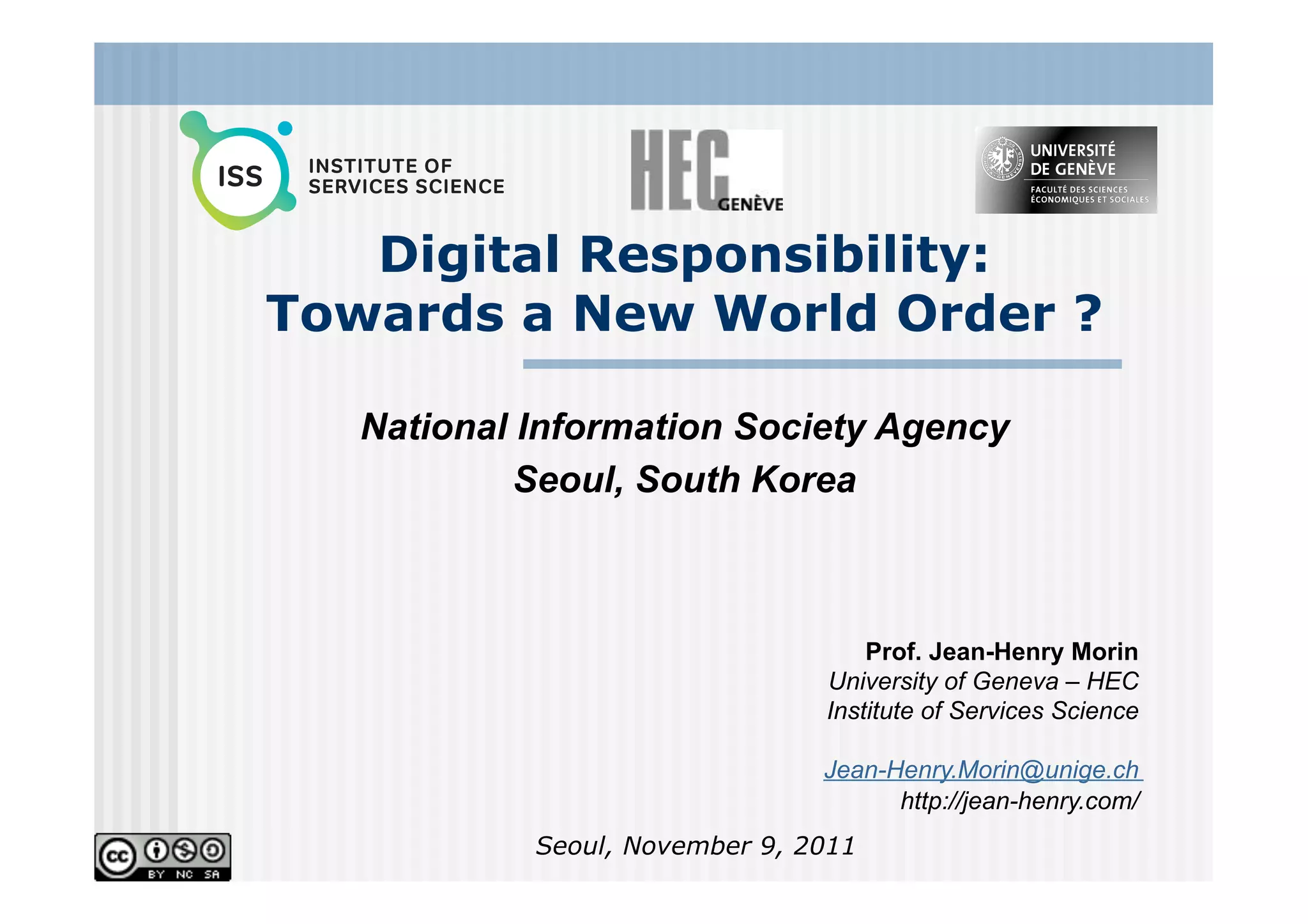 The document discusses digital responsibility and trust issues in the digital age, highlighting three main contexts: the corporate sector, entertainment and media, and cloud computing. It emphasizes the need for a paradigm shift towards user trust, rather than distrust, in information management, and calls for socially responsible management of personal information within social networks. The author posits that digital literacy and participation are essential for shaping a sustainable digital society.
