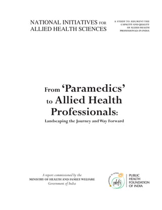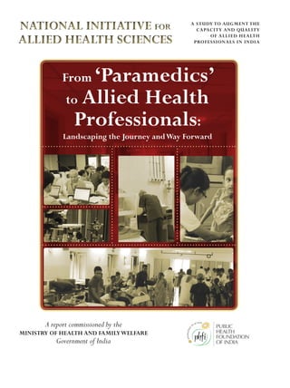 The National Initiative for Allied Health Sciences (NIAHS) aims to enhance the capacity and quality of allied health professionals in India through a strategic framework developed by the Public Health Foundation of India at the behest of the Ministry of Health and Family Welfare. The report emphasizes the need for a shift from a doctor-centered approach to a team-based healthcare model, addressing the substantial gaps in human resources for health amid rising demand for quality services. It proposes the establishment of national and regional institutes for training and retaining allied health talent to ensure effective healthcare delivery and move towards universal health coverage.