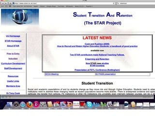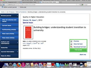 Transitioning to university involves adapting both academically and socially. Universities are taking a more holistic approach to support students through this process from pre-entry through the first year. This includes providing realistic information to help students choose the right program, extensive orientation activities, peer support networks, academic skills development, and access to support services to help students feel engaged and succeed. The goal is to set students up for long-term satisfaction and success through a coordinated, multi-stage transition process.