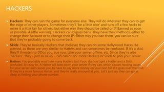 Hackers, skids, and hatters pose threats to Minecraft servers. Hackers use cheating techniques to gain advantages over other players and are difficult to permanently ban. Skids falsely claim hacking abilities and may try to take servers offline through DDoS attacks or recruit other hackers. Hatters are more skilled hackers who could potentially discover personal information to harass server owners. Minecraft originally only required logging into private servers but now offers paid Realms servers directly through Mojang to prevent hacking. The game has expanded from PC to consoles and mobile, opening new markets and allowing cross-platform play through a single version with the "Better Together" update.