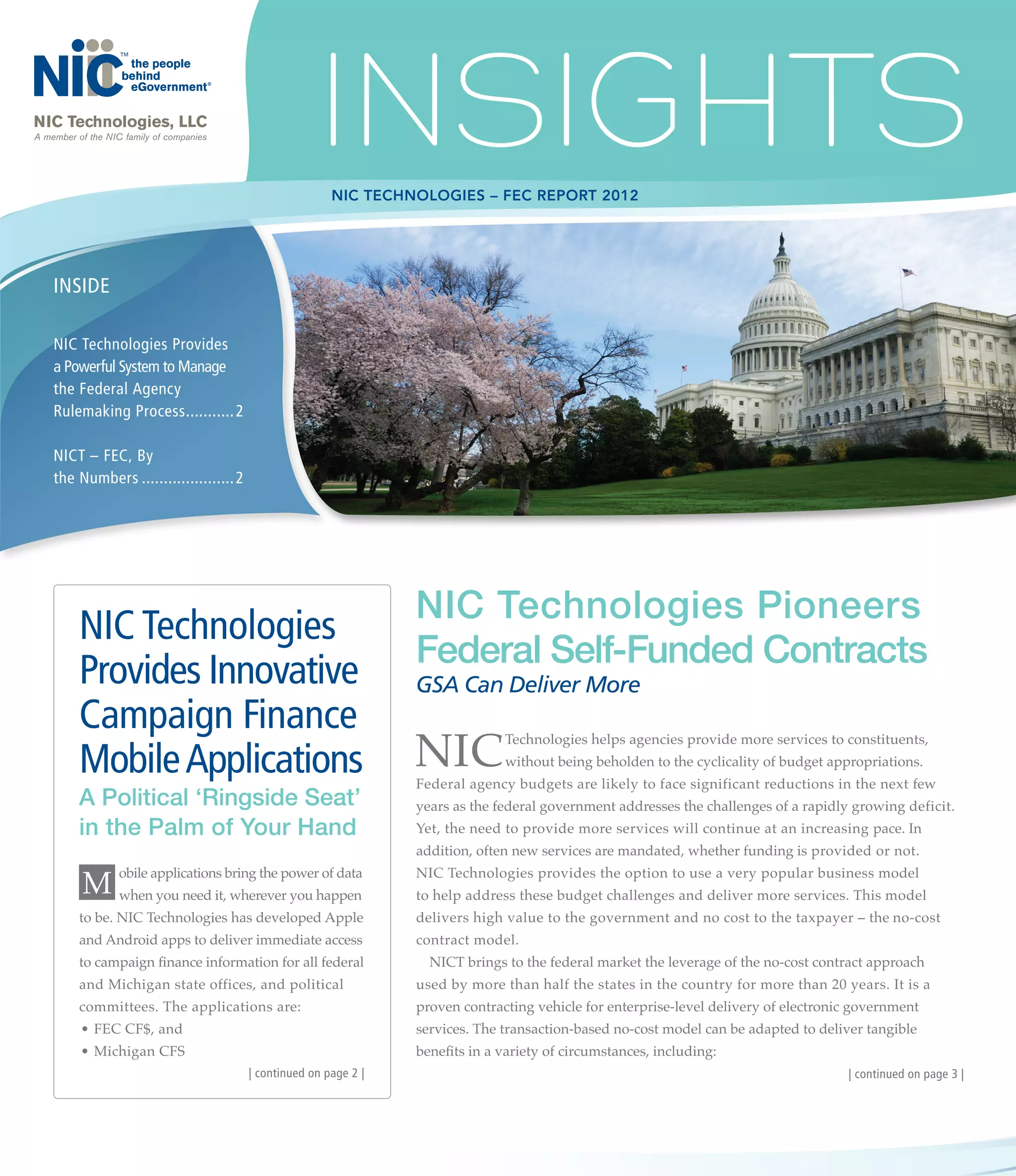 NIC Technologies provides innovative digital government solutions to federal agencies using a self-funded contracting model. It has developed mobile applications to deliver campaign finance information and helps agencies manage the federal rulemaking process through its Searchable Electronic Rulemaking System, which streamlines public comments and access to regulations. The company pioneered this approach to deliver services without taxpayer cost through transaction-based models and has supported over 17 million visits and 29.5 million transactions for the Federal Election Commission.