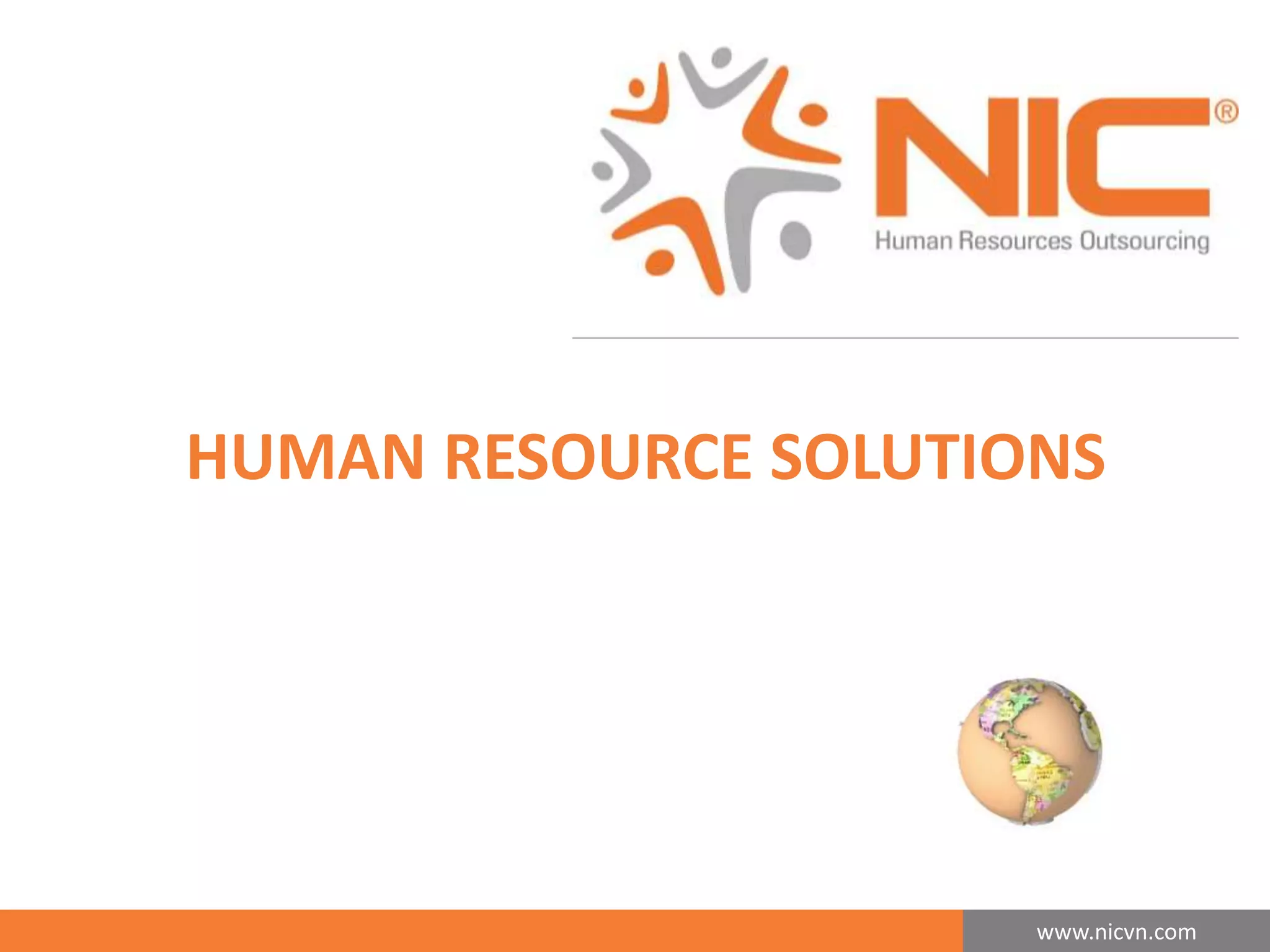 This document provides information about NIC Group, a human resource solutions company based in Vietnam. It outlines NIC's history and core values, as well as the various HR solutions it offers, including representative office licensing, executive search, staffing, and payroll management. The document also describes a premium package for MFLEX that includes customized HR solutions, training, and advisory services. Contact information is provided at the end.