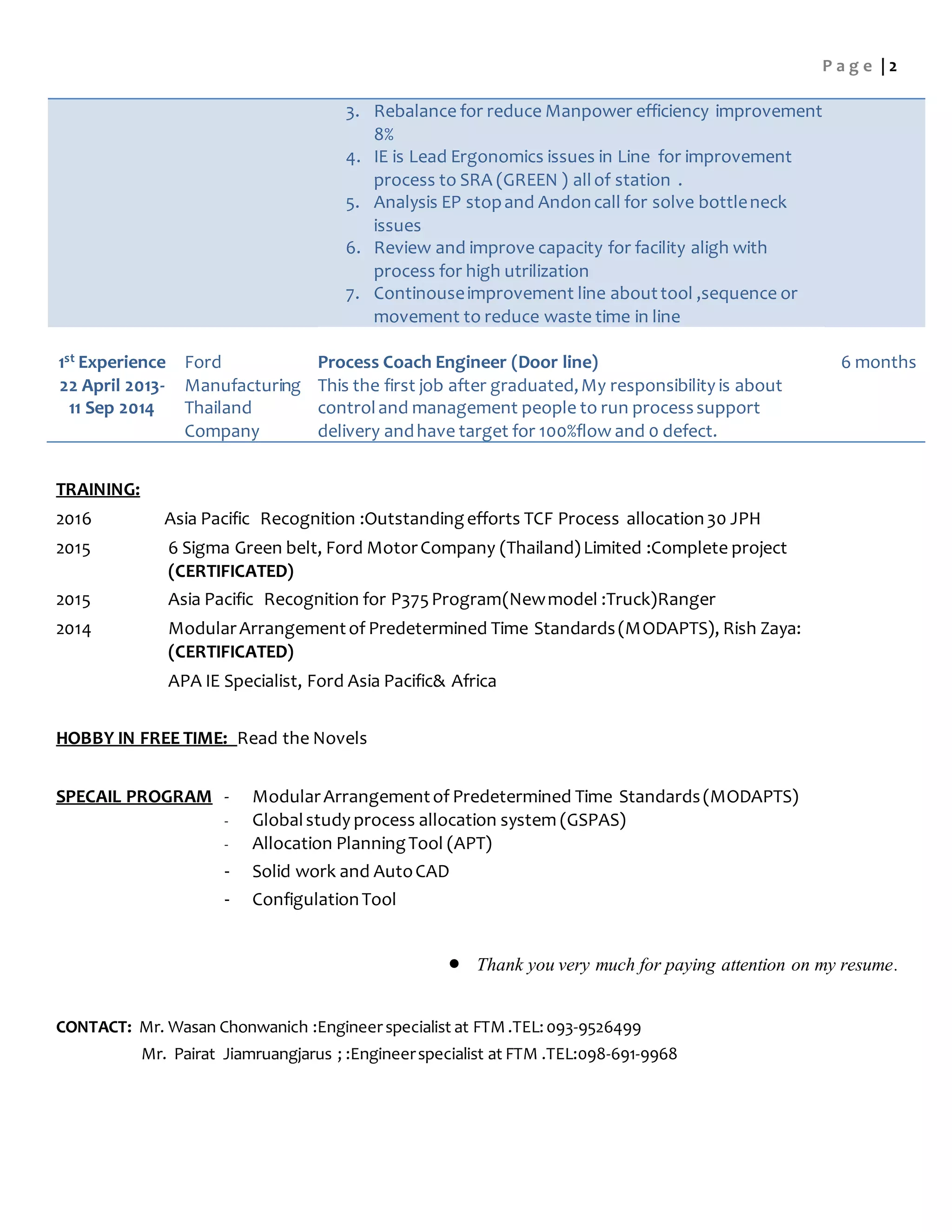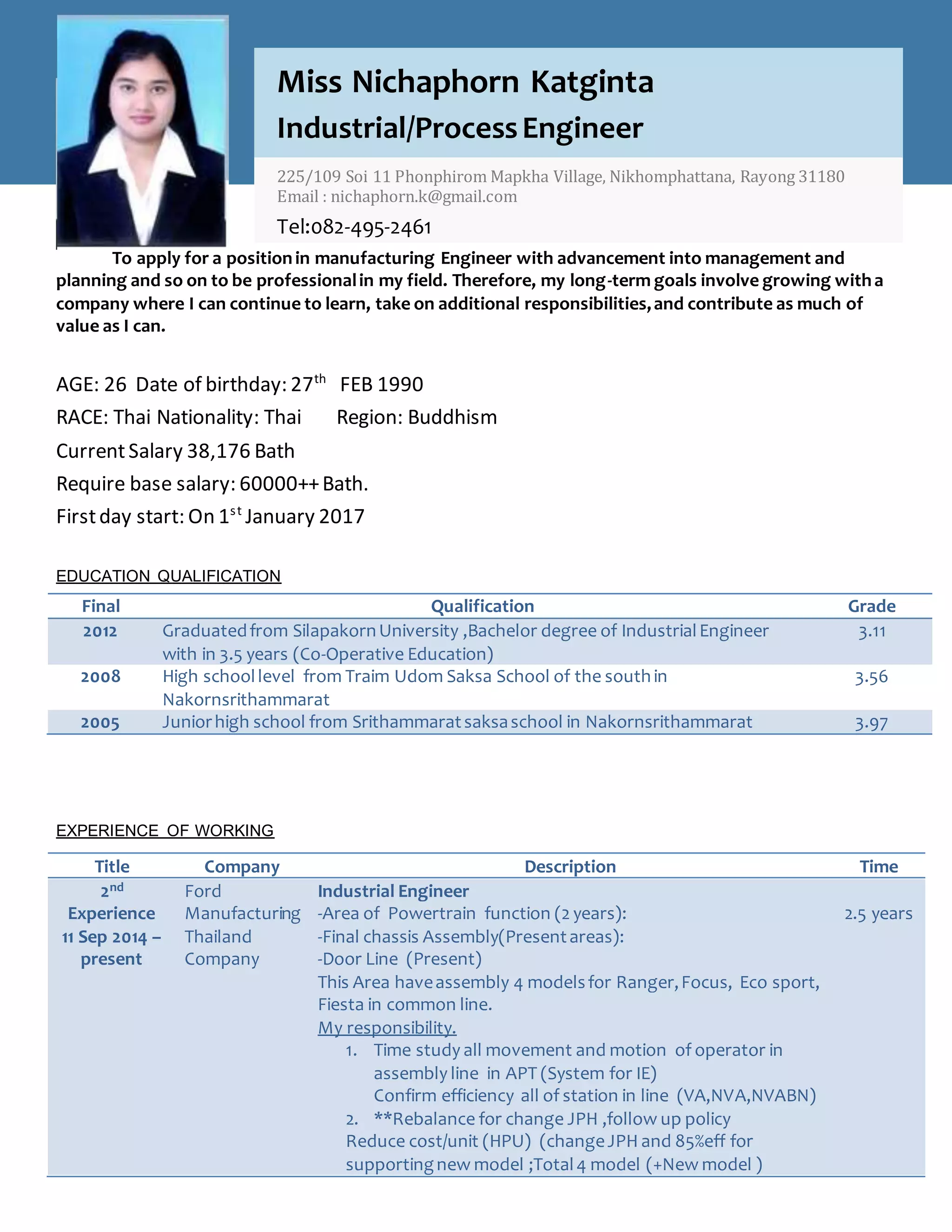 The candidate is applying for a manufacturing engineer position with the goal of advancing into management. They have over 2 years of experience as an industrial engineer at Ford Manufacturing Thailand, where they performed time studies, line balancing, and continuous improvement initiatives to increase efficiency. The candidate holds a Bachelor's degree in Industrial Engineering and has received additional training in Six Sigma and process allocation systems.