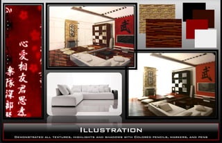 This design portfolio contains illustrations and renderings created by Nichol Hiemstra across various project types including residential kitchens, restaurants, retail pop-up stores, nightclubs, offices, and residential homes. A variety of media were used including colored pencils, markers, pens, Sketchup, and Revit. The portfolio demonstrates skills in hand rendering textures, materials, lighting plans, and 3D digital models.