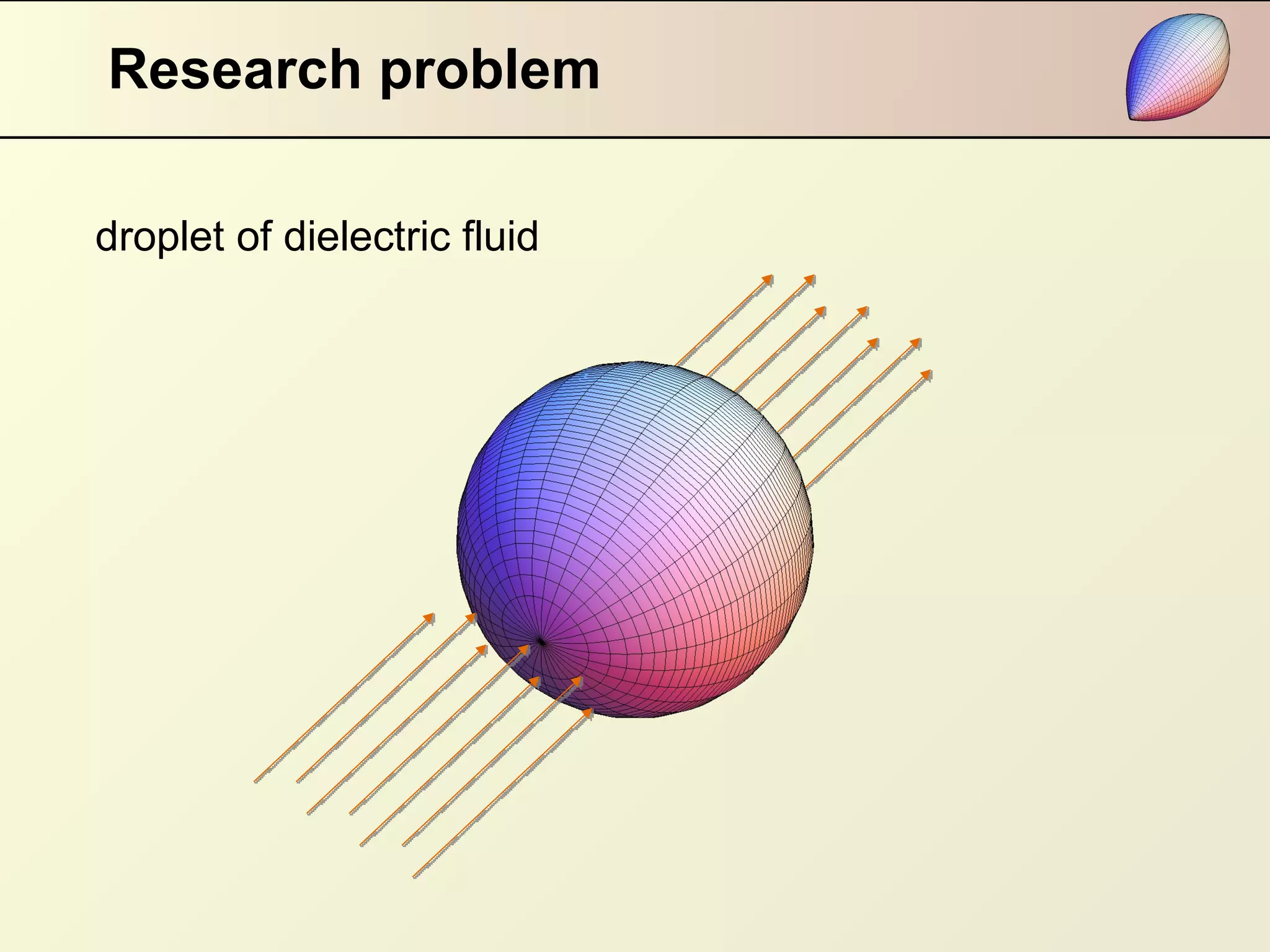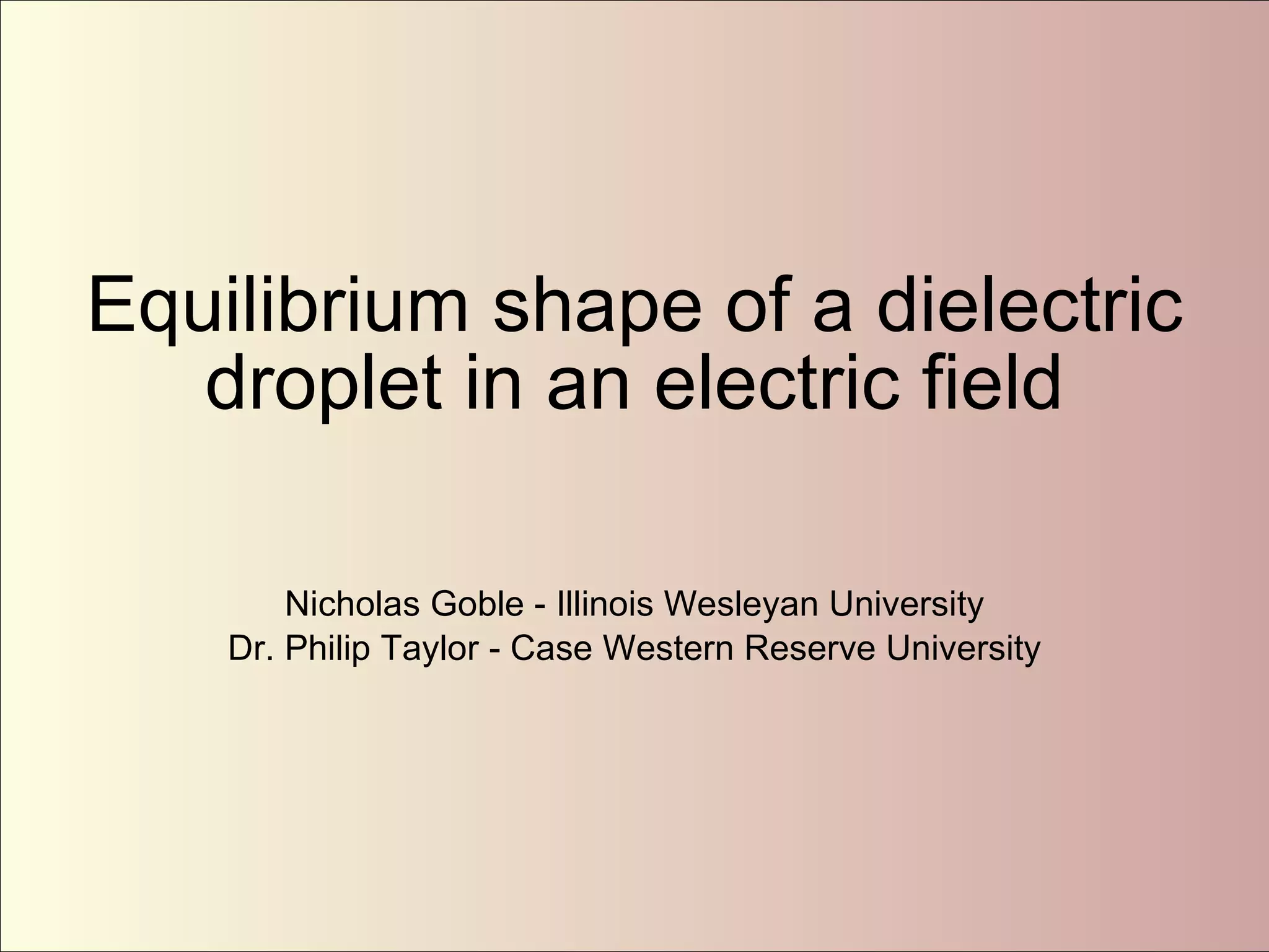 This document summarizes research on modeling the equilibrium shape of a dielectric droplet placed in a uniform electric field. The researchers used a third-order polynomial approximation to represent the shape of the droplet and calculated the total energy as a function of surface energy and electrostatic energy. They were able to determine the shape of the droplet for given dielectric properties and electric field strength. Their results showed that pointed ends develop when a parameter reaches zero, and there is hysteresis in the system depending on the starting point of the energy minimization calculation. The relationship between electric field strength and the angle of pointed ends was found to be nonlinear.