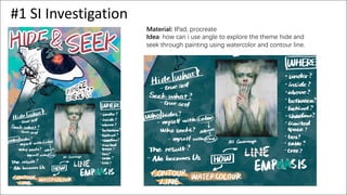 This document contains notes and descriptions for 15 artworks for an AP Art Portfolio by Nichole. Each piece explores the theme of "hide and seek" through paintings using various materials like watercolor and digital art. For each piece, the artist provides information on the materials, process, ideas and inspiration. The works seek to depict the relationship between the "Hider" and "Seeker" aspects of one's personality using techniques like color, composition, lighting and perspective. Progress shots are included for some pieces. The goal is to convey emotions like fear, tension, bewilderment and acceptance through symbolic representations of the characters.