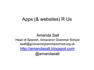 This document contains a list of apps and websites that can be used for teaching Spanish and other foreign languages, as well as general teaching tools. It includes apps for creating presentations, interactive games, quizzes, and assessments. It also lists the contact information for Amanda Salt, the head of Spanish at Grosvenor Grammar School, who compiled the resource list.