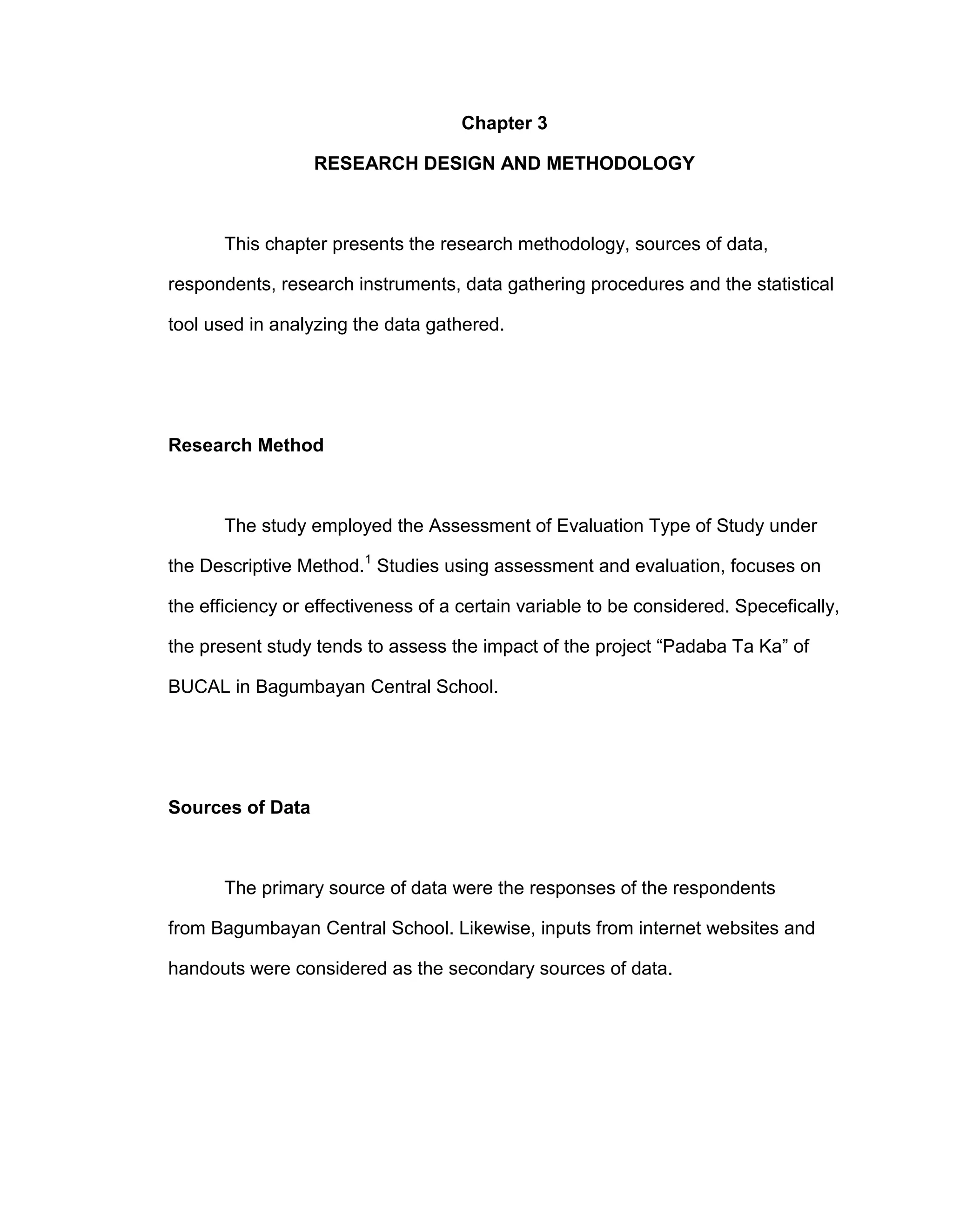 This chapter outlines the research methodology used in the study. It employed a descriptive assessment study to evaluate the effectiveness of the project "Padaba Ta Ka" implemented by BUCAL in Bagumbayan Central School. Data was collected through questionnaires distributed to 10 teachers and 10 parents from the school. The questionnaires used Likert scales and forced choice questions to assess the sustainability and effectiveness of the project. The responses were analyzed using statistical methods such as percentages and ranks.