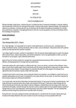 This document is a resume for Nick Mahoney that outlines his professional experience and education. It summarizes that he currently works as a Team Manager at Lloyds Bank where he is responsible for his team's performance and hitting targets. Previously he worked in several customer service and sales roles for companies like Conduit UK, Privilege, and Lloyds Bank. He demonstrates strengths in leadership, coaching, problem-solving, adaptability, and consistently meeting or exceeding targets. His education includes a 2:2 BA in Media Practice from the University of Glamorgan and various GCSE and A-Level qualifications.
