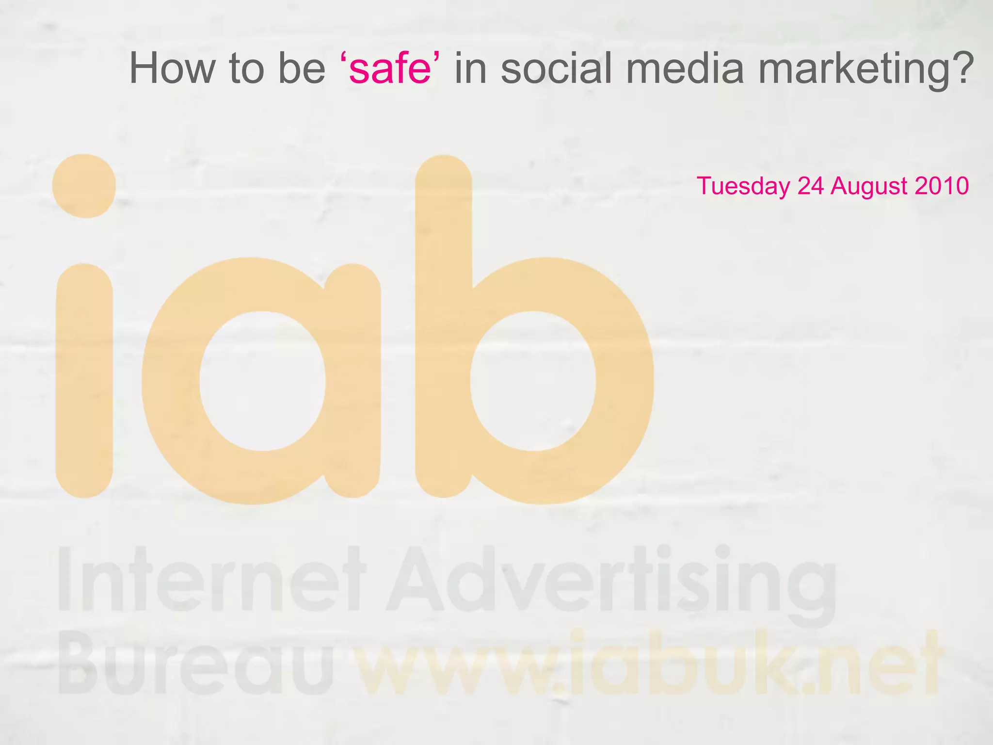 This document discusses regulations around social media marketing. It covers why it is important to market safely, current regulations from bodies like the ASA, and planned changes to extend regulations to cover misleading claims on websites and social media. New rules for marketing in social media will take effect in early 2011 to better protect consumers, especially children, as social media grows in importance. Top tips are provided for marketers to familiarize themselves with the new rules and ensure their social media activities comply.