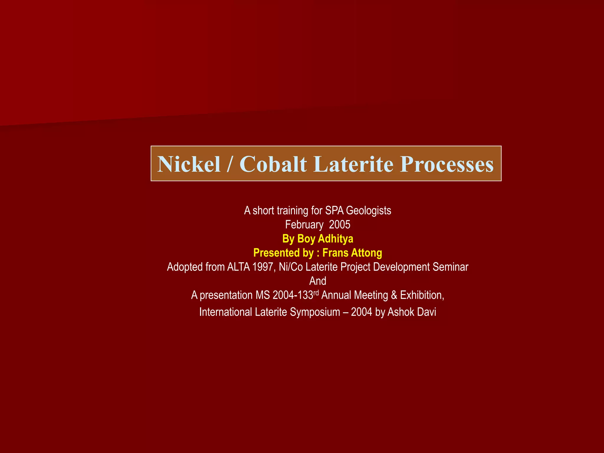 The document provides information on nickel/cobalt laterite processes including mineralogy, typical ore compositions, process routes, and examples of operating plants. It describes the key steps in pyrometallurgical processes including ore preparation, drying, calcination/reduction, smelting to produce ferronickel or matte, and refining. The pressure acid leach and reduction roast-ammonia leach hydrometallurgical processes are also briefly covered. Process flowsheets for INCO's nickel operations in Indonesia illustrate ore drying, reduction kilning, electric furnace smelting, and matte converting steps.