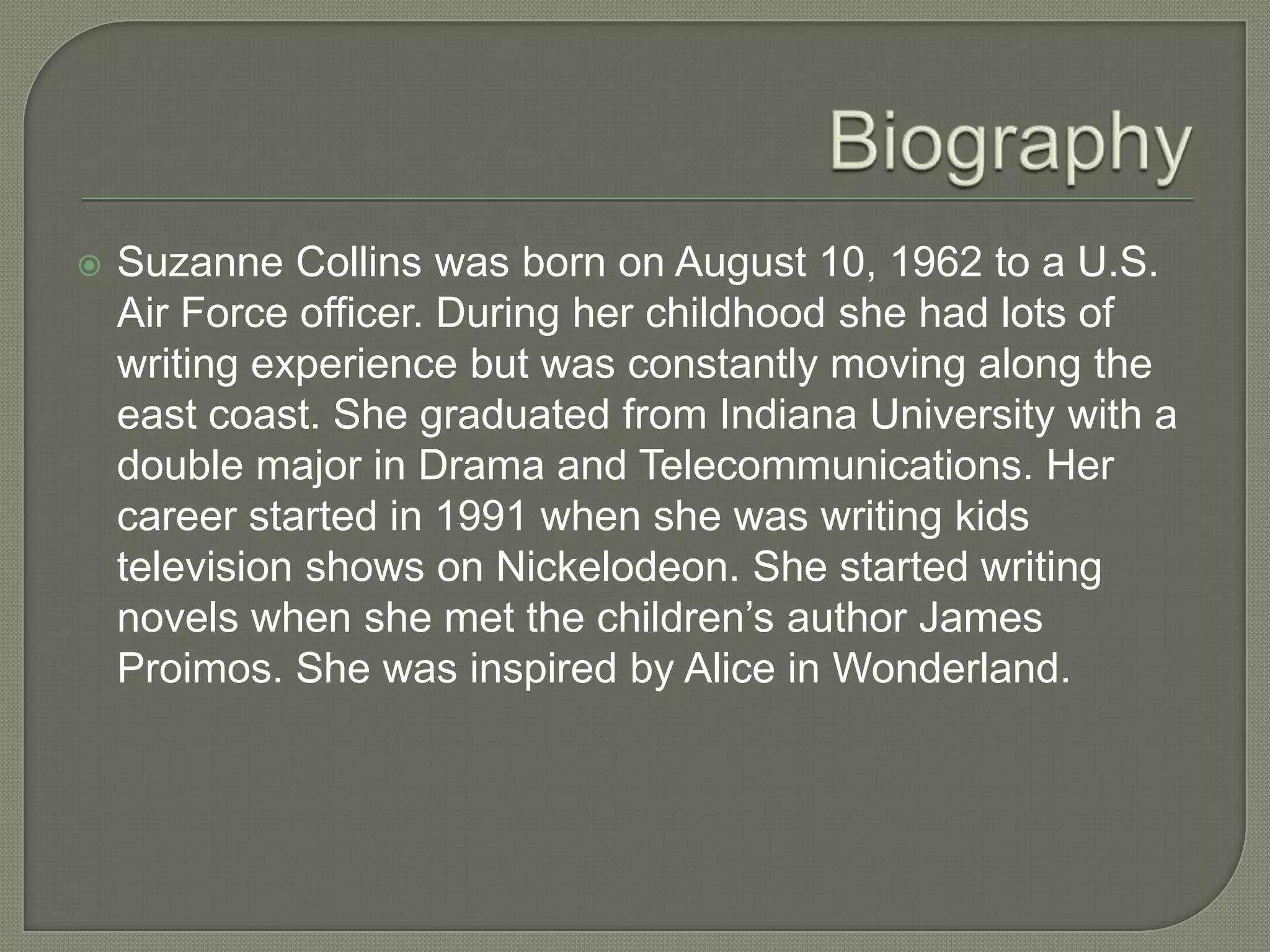 Suzanne Collins is an American author born in 1962. She had a varied career writing for television before starting to write novels inspired by Alice in Wonderland. Her most famous work is The Hunger Games trilogy about a dystopian future where children compete in an annual fight to the death that is televised. The first book follows Katniss Everdeen as she volunteers for the Hunger Games to save her sister, joining fellow tribute Peeta as they fight for survival in the competition.