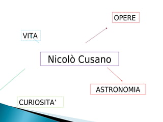 Nicolò Cusano, nato nel 1401 in Germania, è stato un pensatore e politico che ha contribuito alla filosofia, all'astronomia e alla tolleranza religiosa durante il periodo umanistico. Tra le sue opere principali, 'De pace fidei' promuove il dialogo tra le religioni e la ricerca della pace, mentre 'Docta ignorantia' esplora la natura della conoscenza umana. Cusano ha anche avanzato idee astronomiche rivoluzionarie, sostenendo una visione eliocentrica e contribuendo allo sviluppo di strumenti scientifici come l'igrometro.