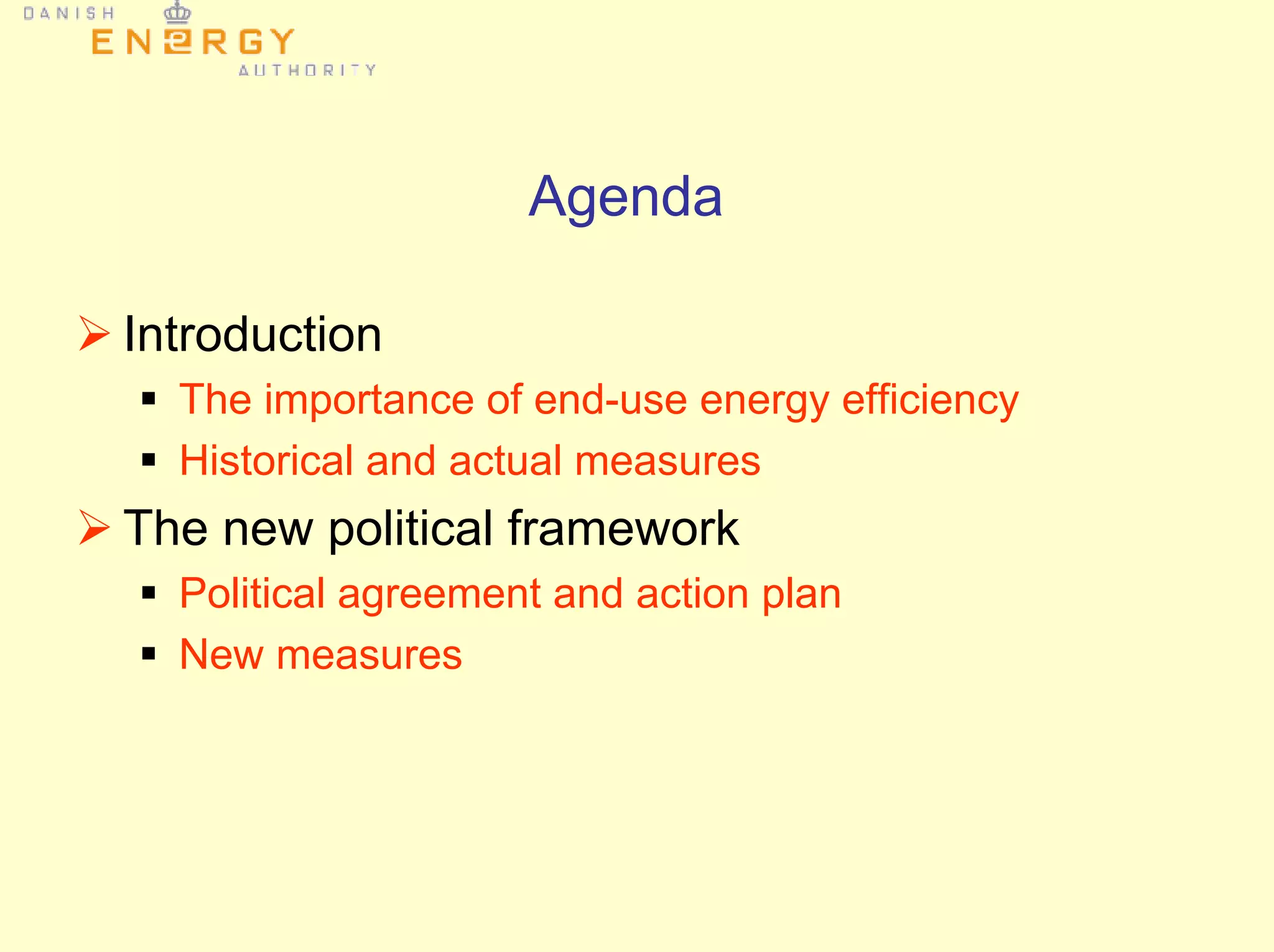 The document outlines Denmark's new structure for end-use energy efficiency activities, focusing on historical measures and political frameworks aimed at reducing final energy consumption. It highlights various efficiency measures implemented, such as energy taxes, building codes, and a broad political agreement on conservation efforts targeting a 1.7% annual reduction in energy consumption. The potential for further energy savings is emphasized, with significant opportunities in space heating and a call for policies to overcome market barriers.