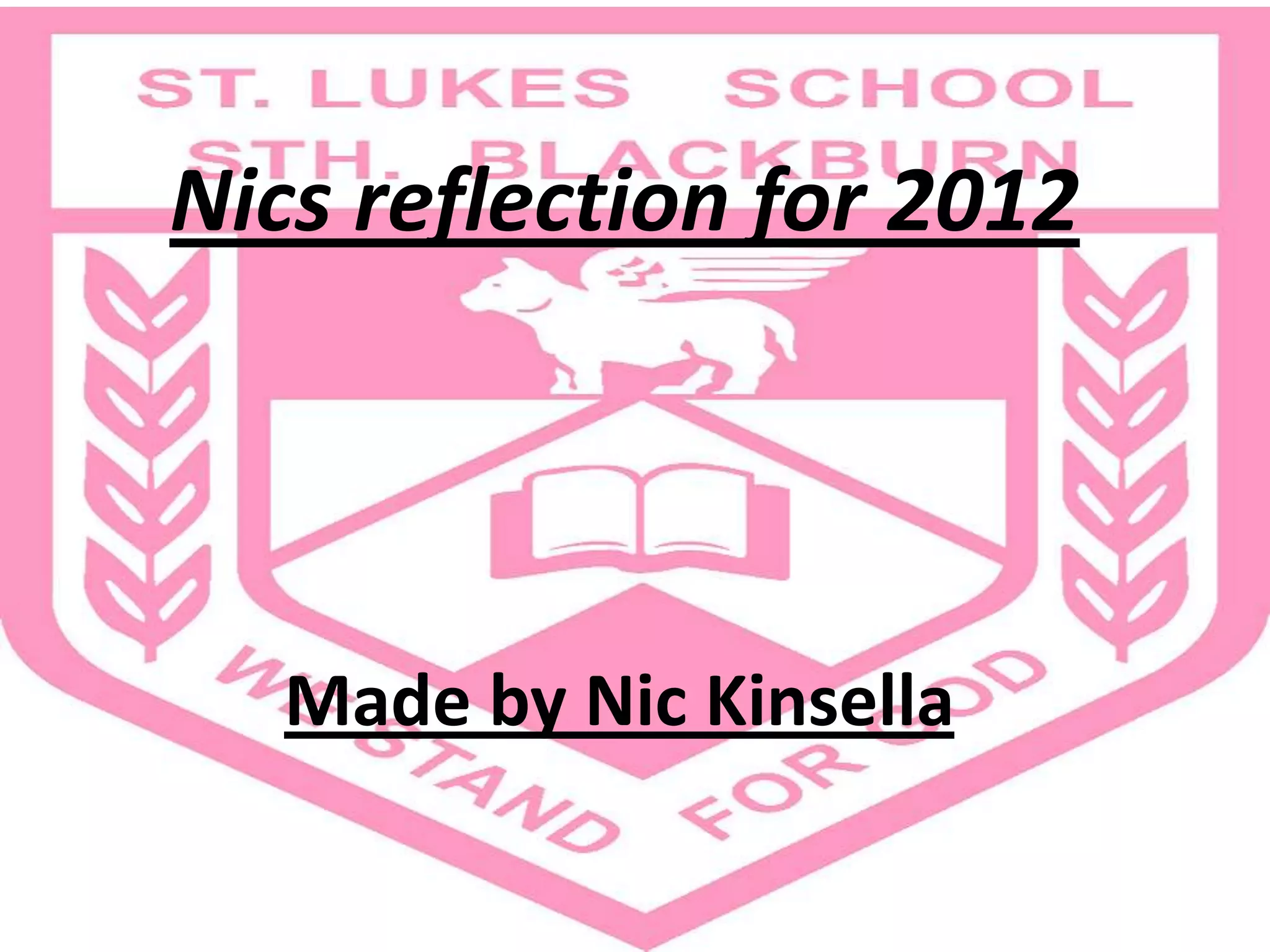 Nic reflects on the highlights of 2012, their first year at St Lukes. Some of the key subjects and activities Nic enjoyed were creating narratives in writing, learning about natural disasters in inquiry projects, and learning different techniques in art class. Nic also enjoyed participating in positive education lessons and various sports. Overall, Nic viewed 2012 as their best year at St Lukes so far due to fun activities and getting to know classmates better.