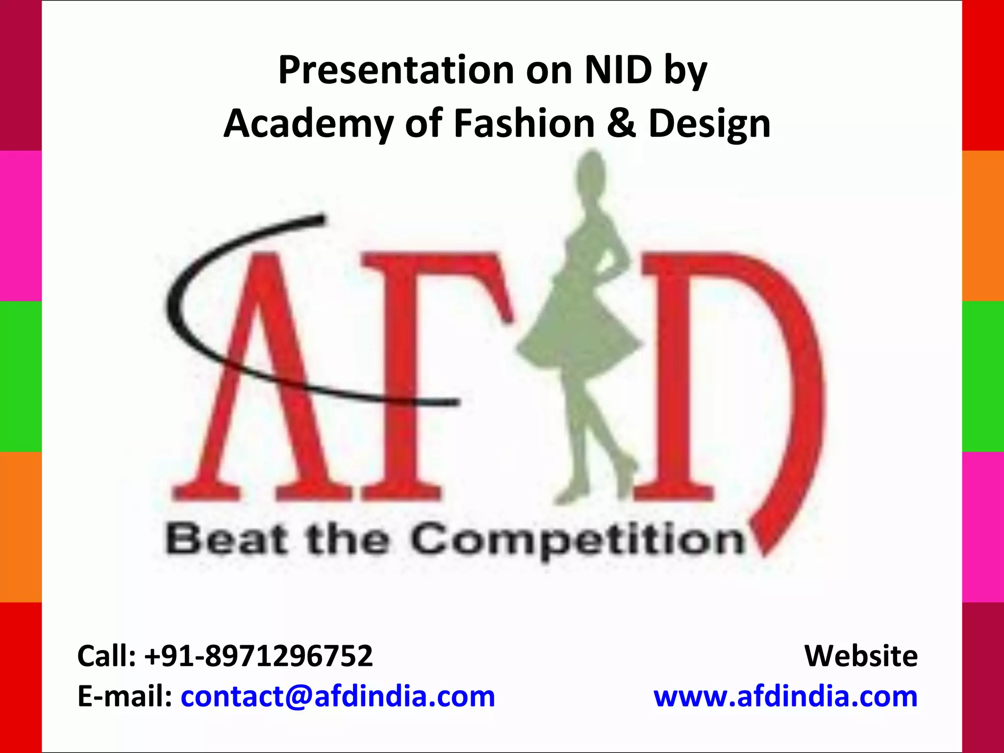 The presentation provides information about the National Institute of Design (NID) in India. It discusses that NID was established in 1961 by the Government of India and currently has three campuses offering undergraduate and postgraduate programs in fields like industrial design, communication design, textile and apparel design. It provides details about the various courses offered at different campuses and their eligibility criteria. It also gives an overview of the admission process and sample questions asked during admissions. Finally, it promotes an academy that provides training to help students prepare and get admission into NID and other design institutes.