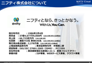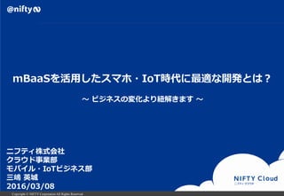 Corporation All Rights Reserved. mBaaSを活⽤用したスマホ・IoT時代に最適な開発とは? 〜~ ビジネスの変化より紐紐解きます 〜~ ニフティ株式会社 クラウド事業部 モバイル・IoTビジネス部 三嶋 英城 2016/03/08