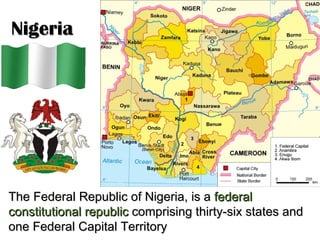 The Federal Republic of Nigeria is a federal constitutional republic located in West Africa on the Gulf of Guinea. Nigeria has 36 states and a Federal Capital Territory, and is the most populous country in Africa with over 200 million people. Nigeria was a British colony from 1851 to 1960, and its economy has long been centered around oil production, though oil revenue has been mismanaged, leading to debt and corruption issues.